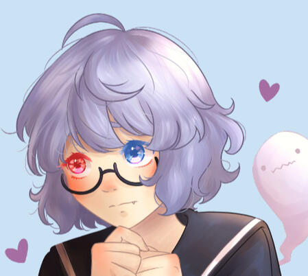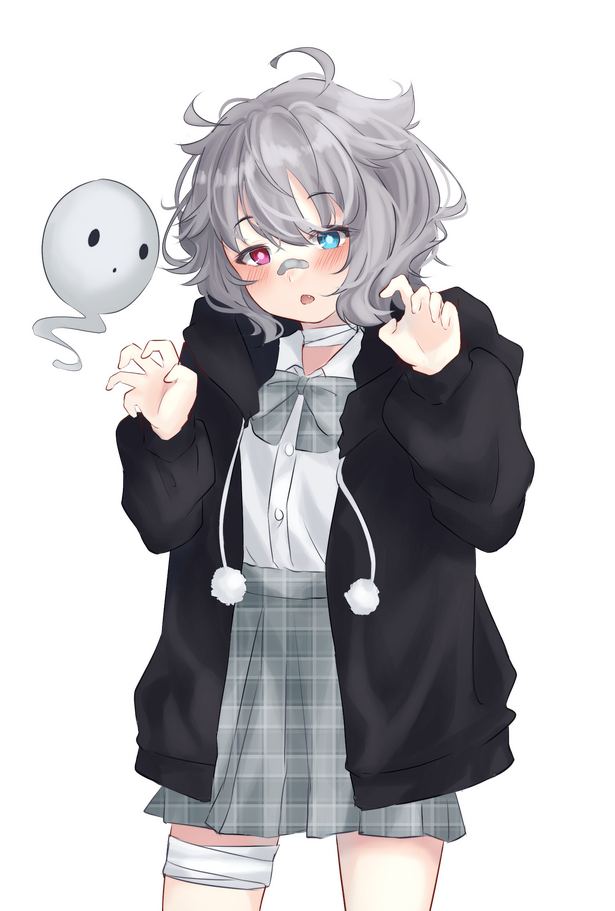 Very pale, ghostly skin tone with curled and messy grey hair. Hair to be drawn above the shoulders or just below. Hair has two "devil horn" type spikes (Not in a way that is defying gravity but more of a bedhead, just woken up, messy concept). Eyes are heterochromic with one pink and one blue. Ghosts can be seen within the eyes. Eye shape is droopy and tired.Clothing choice is ouji or gothic/military lolita or alternatively a seifuku styled uniform.Other notable details: GhostKohai has fangs in the mouth and one visible when the mouth is closed. A ghost entity can always be seen with them. Optional details include a plaster/bandaid on the nose and bandages around the neck, left thigh and right wrist.(On pc all images wont show straight away and you may need to scroll first)