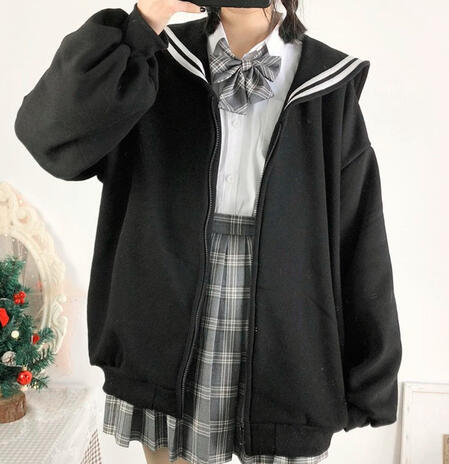 Seifuku styled uniform with an oversized hoodie that has ribboned sleeves. Either shorts or skirt to be worn under the hoodie. Ribbon on collar. Plaster/bandaid seen on face and a bandage around the neck.
