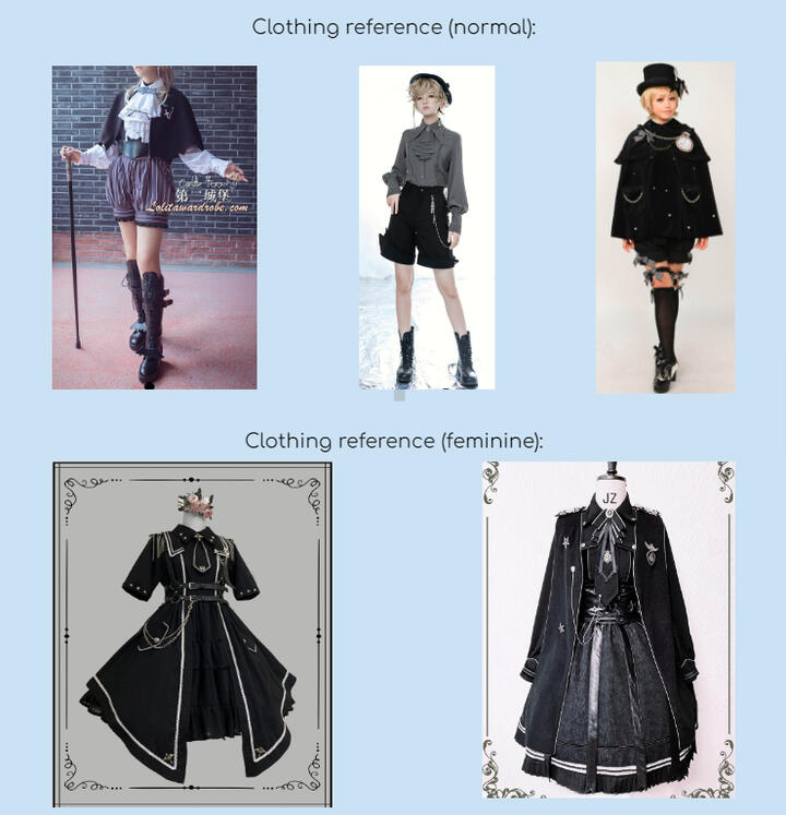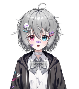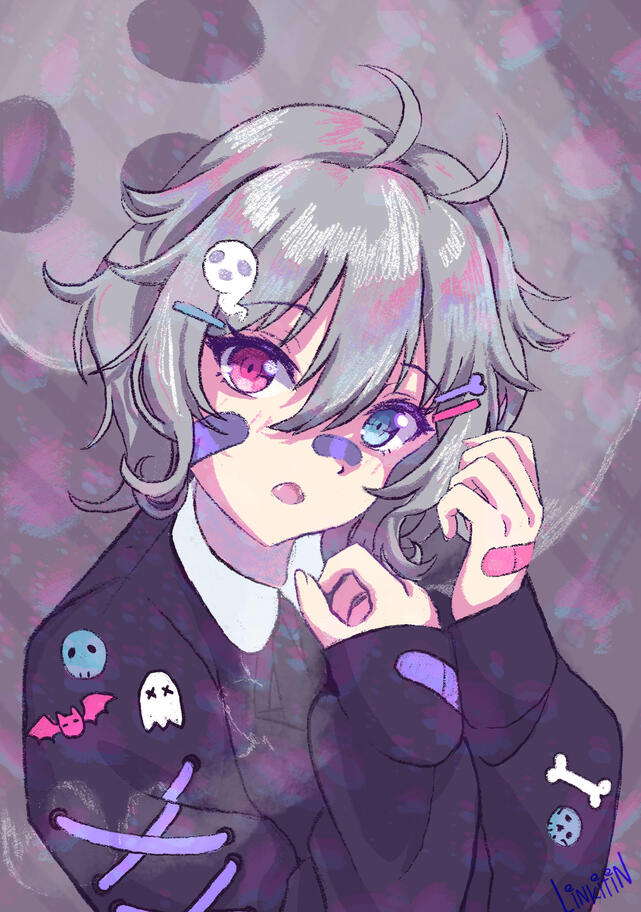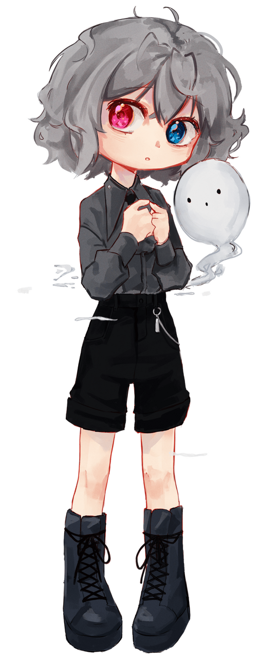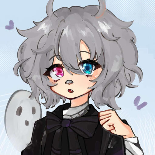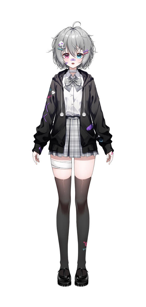 Very pale, ghostly skin tone with curled and messy grey hair. Hair to be drawn above the shoulders or just below. Hair has two "devil horn" type spikes (Not in a way that is defying gravity but more of a bedhead, just woken up, messy concept). Eyes are heterochromic with one pink and one blue. Ghosts can be seen within the eyes. Eye shape is droopy and tired.Clothing choice is ouji or gothic/military lolita or alternatively a seifuku styled uniform.Other notable details: GhostKohai has fangs in the mouth and one visible when the mouth is closed. A ghost entity can always be seen with them. Optional details include a plaster/bandaid on the nose and bandages around the neck, left thigh and right wrist.(On pc all images wont show straight away and you may need to scroll first)